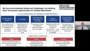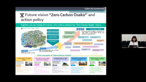 Next up was a presentation by Ms. Yuko Ihara, Director for Environmental Policy, Environment Bureau, Osaka City Government. In the IURC, Osaka is paired with Greater Manchester to work on climate change issues. Before discussing Osaka City’s Action Plan for Global Warming Countermeasures, Ms. Ihara made an introduction to the “Expo 2025 Osaka, Kansai, Japan” that will feature ideas and innovations contributing to the SDGs. With the theme of “Designing Future Society for Our Lives”, the expo will feature an integrated resort attraction initiative, which will be powered by renewable energy. As for the Action Plan for Global Warming Countermeasures, she outlined the five concepts behind the “Zero Carbon Osaka” campaign. These concepts are: (i) a city enabling low-carbon lifestyles; (ii) a city filled with a mindset of decarbonisation and decarbonisation-first actions; (iii) a city in which new environmental technologies such as for new mobility services are well incorporated in various parts of the city system; (iv) a city of public-private partnerships and international networks; and (v) a city resilient to climate change and disasters.