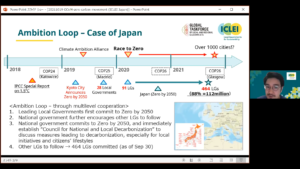 Helping to set the scene for the webinar was Mr. Togo Uchida, Executive Director of ICLEI-Japan, who presented the “Race to Zero” approach in Japan. He explained the “Ambition Loop” through multilevel governmental cooperation, where some leading local governments first committed to Zero Carbon by 2050 and then the national government immediately established a Council to push local initiatives, resulting in many other local governments following suit. To date, 464 local governments in Japan representing 88% of the country’s population had to date committed themselves to the zero carbon target by 2050. However, as impressive as these figures may seem, he noted that local governments also needed to revise their Territorial Mitigation Plans and ensure that their mid-term targets were ambitious enough and well aligned to achieving the 2050 targets.