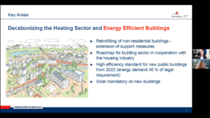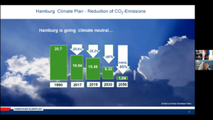 Two speakers from Hamburg – Mr. Thomas Jacob, Head of International Projects, Senate of the Free and Hanseatic City of Hamburg, and Ms. Brigitte Köhnlein, Deputy Head, Hamburg Ministry for Environment, Climate, Energy and Agriculture (both also spoke at the “New Green Possibilities” Forum in July 2021) – presented the “Hamburg Climate Plan”, which aims to achieve 55% and 95% reduction by 2030 and 2050 respectively. Awarded the “European Green Capital” title back in 2011, Hamburg has set targets for 2030 for each of the four sectors: (i) private households, (ii) trade, commerce and services, (iii) industry, and (iv) traffic. It has prescribed more than 400 measures which require two billion euros of investment to achieve a four-million-ton reduction by 2030. The plan has identified the heating sector and energy efficient buildings as well as transport as key areas. For buildings, it promotes the retrofitting of non-residential buildings, high efficiency standards for new public buildings and solar mandatory requirements on new buildings. For transport, it promotes the expansion of public transport, cycling, bike sharing, e-mobility and logistics such as LNG infrastructure for trucks.