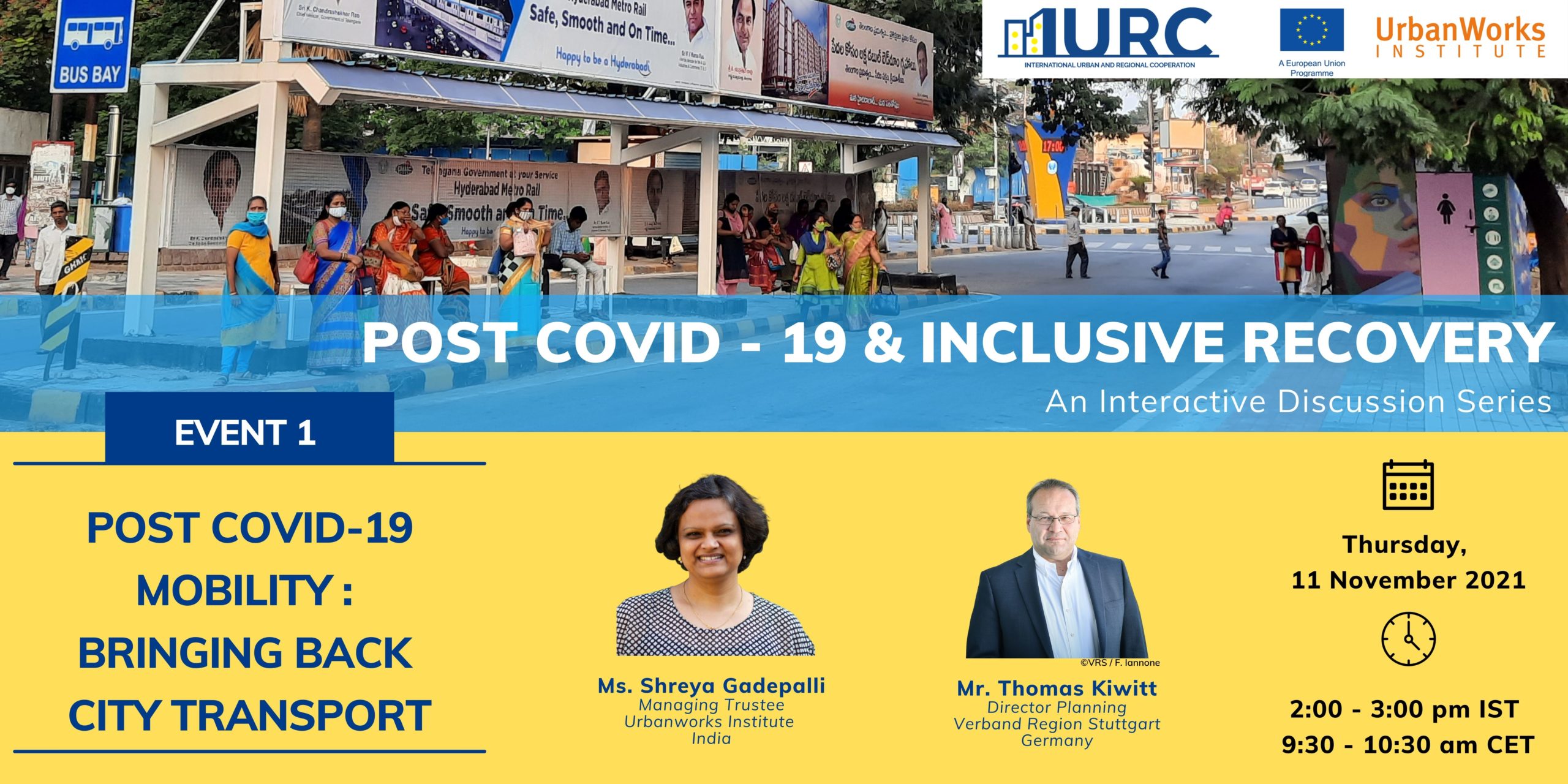 2:00 – 3:00 pm IST / 9:30 – 10:30 CETAs part of the IURC Asia and Australasia programme, we invite you to our interactive discussion series on Post COVID-19 and Inclusive Recovery. IURC recognises the need to deliberate on the implications of COVID, by carrying out a series of regular discussion events on different urban topics (1. Mobility; 2. Health; 3. Economy; 4. Education; 5. Environment; 6. Gender). The objective is to discuss urban challenges, showcase best practices by/for cities for inclusive recovery from COVID-19, encourage replication, and strengthen the regional/global approach of IURC. The series is open to public officials, policy makers, planners, researchers, academia, NGOs, students and other stakeholders. Recipients of this information should feel free to share it with other stakeholders.