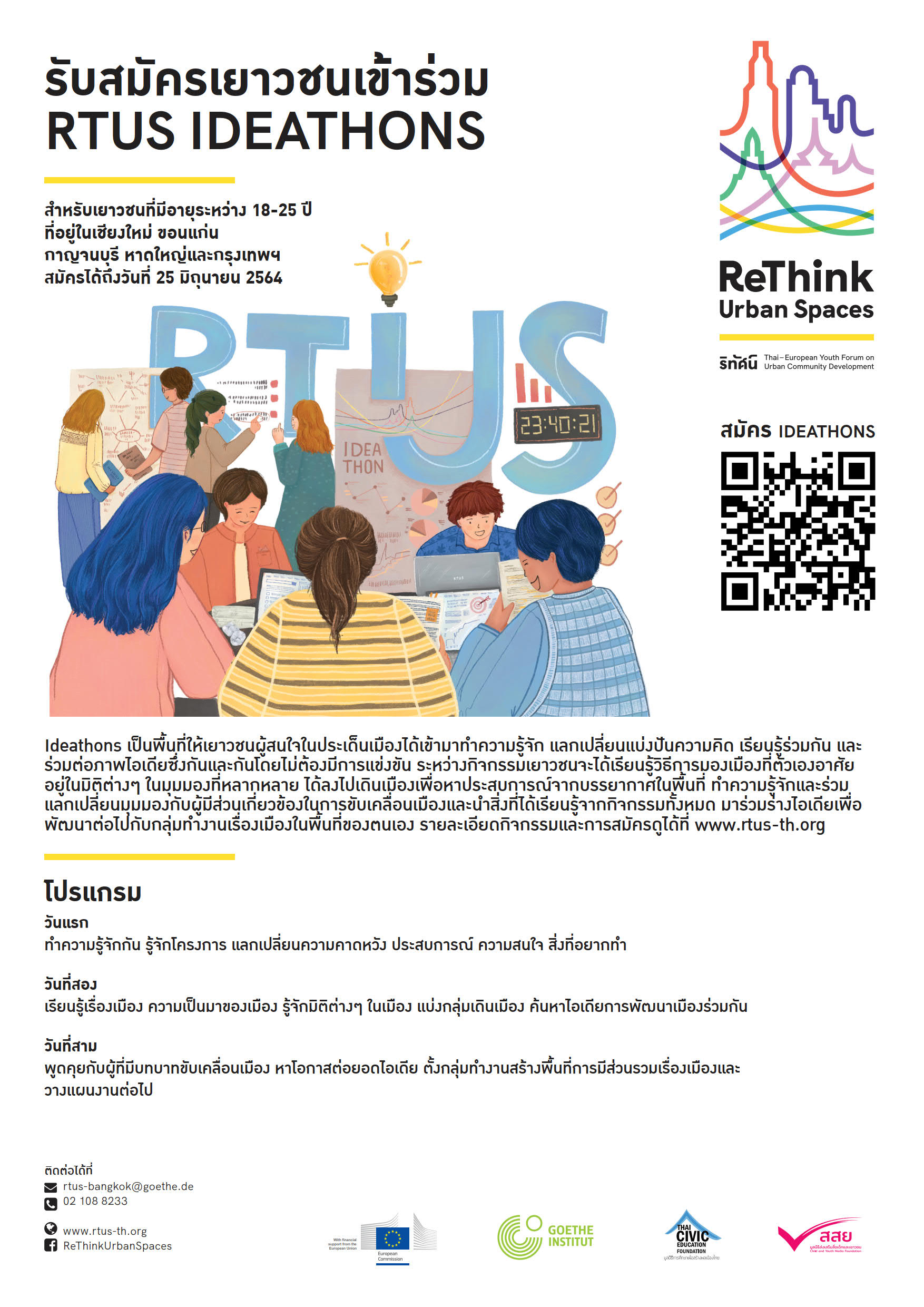 “RTUS IDEATHON” is an activity supervised by ReThink Urban Spaces-RTUS, a Thai-European Youth Forum on Urban Community Development, a programme funded by the European Union. With the cooperation of the Goethe-Institut Thailand, Thai Civic Education Foundation and Child and Youth Media Foundation.
