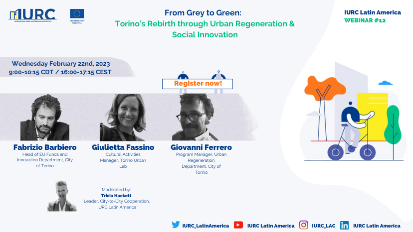 The webinar “From Grey to Green: Torino’s Rebirth through Urban Regeneration & Social Innovation” organized by the International Urban and Regional Cooperation Latin America (IURC-LAC) Programme sougth to share insights about the transformation of Torino which used to be known as the “City of the Automobile of Italy” to a city renown for design, culture, innovation, social inclusion and sustainability. The webinar provided a preview of the city to the delegates that participated in the Torino’s Cities Forum.