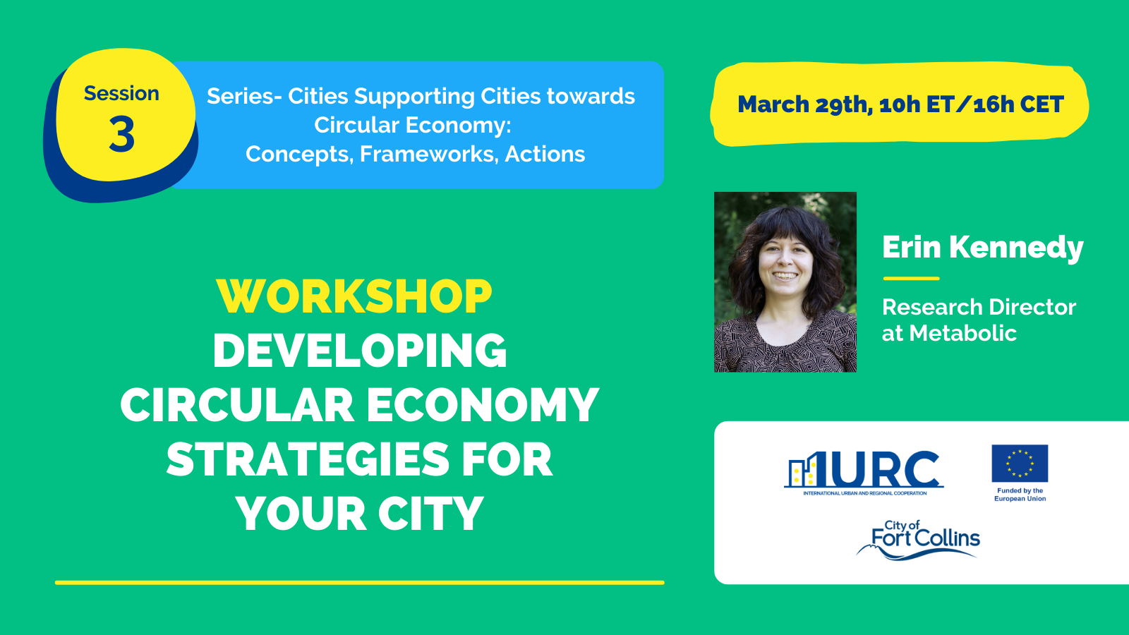 In this interactive workshop, Circular Economy Expert Erin Kennedy from Metabolic – a Netherlands-based organization who has over a decade of experience advising businesses, governments, and nonprofits around the world on how to thrive in a circular economy – will offer practical advice and strategies to help cities develop and implement their circular economy plans.