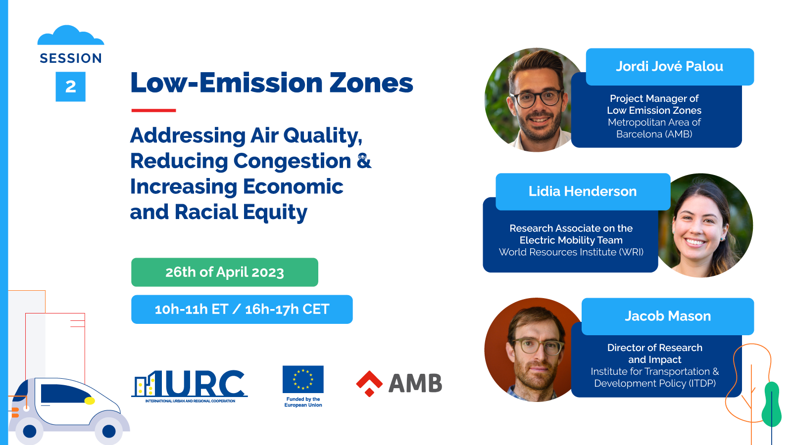 During our second Sustainable Urban Mobility and Transport session, you will learn from Jacob Mason from ITDP what low-emission zones (LEZ) are and what can make them more successful. Hear directly from Jordi Jové from the Metropolitan Area of Barcelona, Spain, how they were able to implement their expansive LEZ and considerably reduced private vehicles and greenhouse gas emissions, and gain insights from Lidia Henderson from WRI on how to address the challenges to implement a LEZ in your city. The three speakers will also explain how LEZ, beyond improving air quality and reducing congestion, can be an important economic and racial equity tool.