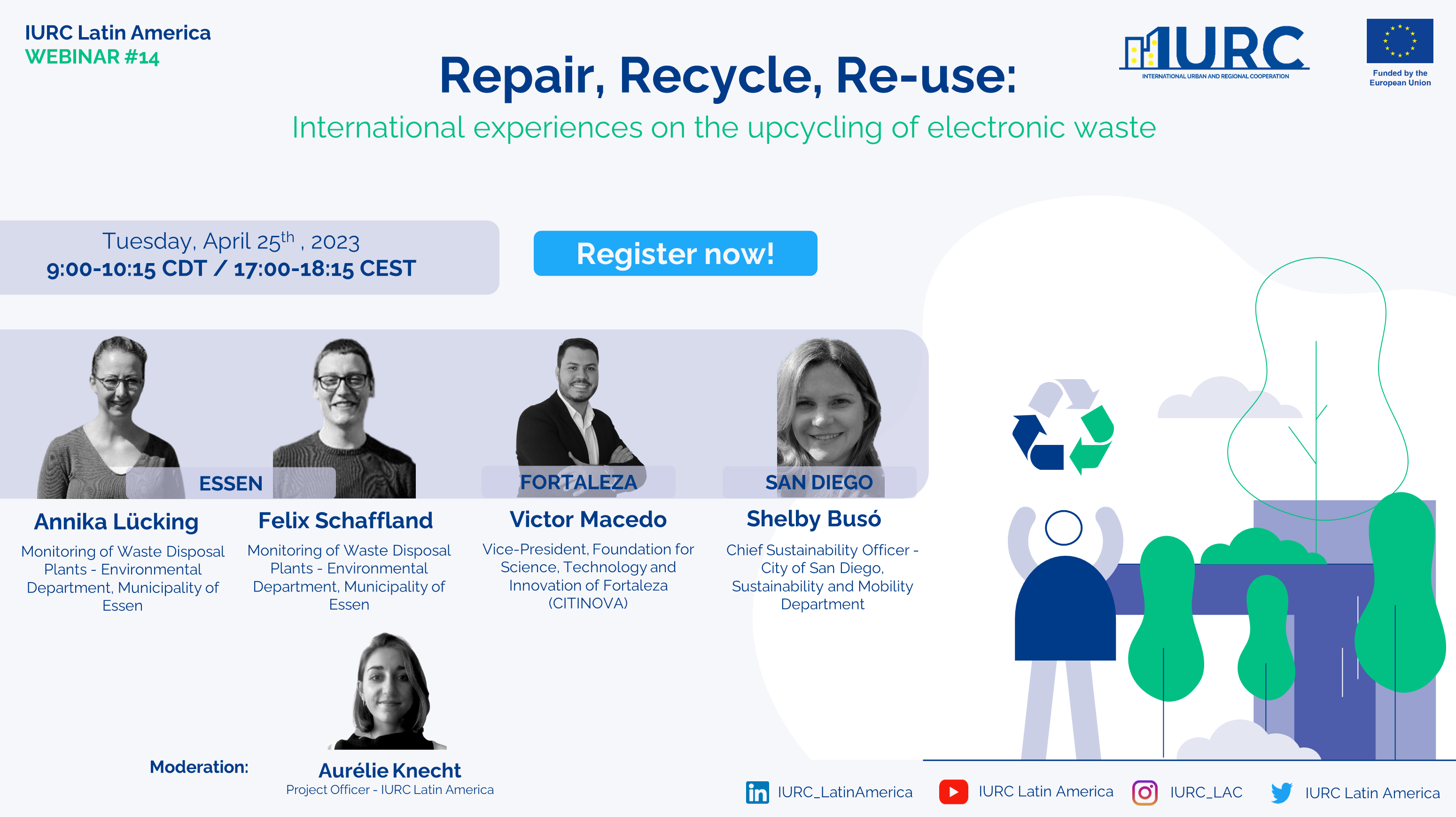 The webinar “Repair, Recycle, Re-use: International experiences on the upcycling of electronic waste” organized by the International Urban and Regional Cooperation Latin America (IURC-LAC) Programme sougth to share inspiration about circular economy best practices, focused on the re-use, recycling, and repair of electronic waste and other materials. Three international experiences on the creation of recycling centres and related repairing initiatives were discussed to highlight opportunities and challenges linked to upcycling experiences in cities.